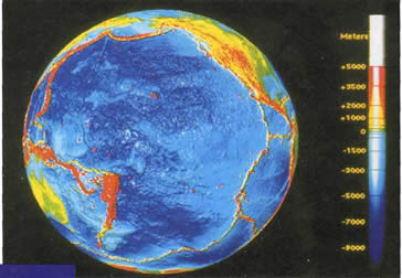 Pacifički vatreni prsten Kompjuterski prikaz Zemlje sa izdvojenim trustnim područjima (crvena boja), poznatim kao "vatreni prsten", razmeštenim duž obala Tihog okeana. Dubina okeana i kopneni visovi kodirani su bojama prema skali na desnoj strani |