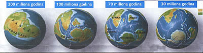 Pomeranje kontinenata Pre 200 miliona godina, kao rezultat tektonike ploča, superkontinent Pangea počeo je da se cepa na posebne kopnene mase i kontinente. |