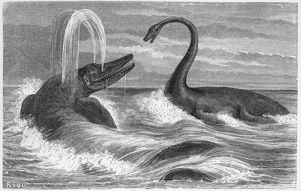 Tokom mezozoika morima su vladali gmizavci koji su dostizali impozantne dimenzije i predstavljali predatore koji su se nalazili na samom vrhu u lancu ishrane; hranili su se ribama, glavonošcima, školjkama pa čak i jedni drugima. Među najpoznatijim izumrlim morskim gmizavcima je pleziosaurus, čije je fosilne ostatke po prvi put, početkom 19. veka u Engleskoj, otkrila Meri Ening (Mery Anning)(sl. 7). Ovaj gmizavac je mogao da dostigne dužinu od oko 3,4 m i težinu od oko 180 kg, posedovao je malu glavu, oštre zube, dugačak i uzan vrat i kratak rep. Jedan drugi morski džin pod nazivom ihtiosaurus koji je po svom izgledu podsećao na delfine, posedovao je veoma oštre zube kojima je uspešno hvatao plen, kao i oči koje spadaju među najveće koje su do sada nađene u životinjskom carstvu a koje su mu omogućavale odličan vid u dubokim okeanskim prostorima. sl. 8