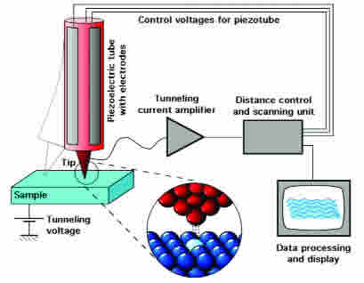 Slika 2. Šematski prikaz STM spektroskopije. STM omogućava vizuelizaciju oblasti sa visokom gustinom elektronskih stanja i na taj način uočava poziciju individualnog atoma. Koristi se za dobijanje slike površina provodnih uzoraka. Rezolucija ove tehnike je 0.2 nm. Veoma oštar vrh (tip) STM-a se kreće po površini uzorka. Uzorak i tip se nalaze pod naponom i u zavisnosti od njegove veličine elektroni će se kretati (tunelovati) između površine uzorka i tip-a, što ima za posledicu pojavu slabe električne struje. Veličina ove struje zavisi od rastojanja između tip-a i površine uzorka i njena promena se vizuelizuje kao izgled površine uzorka. Ova tehnika se ne može koristiti kod izolatorskih uzoraka što je njen glavni nedostatak.. |