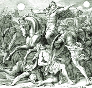Petoro amoritskih vladara - iz Jerusali- ma, Hebrona, Lahisa, Jarmuta i Jeglona - zajedno su krenuli u borbu protiv Isusa Navina. Do bitke je došlo kod grada Gavaona, severno od Jerusalima, koji je bio lojalan Navinu. Sve je išlo u prilog njegovim snagama. Isus Navin je tada zamolio boga da zaustavi Sunce i Mesec. Bog je uslišio njegovu želju i time mu omogućio da dokrajči neprijatelje na bojnom polju jer je Sunce bilo na nebu skoro čitav dan.