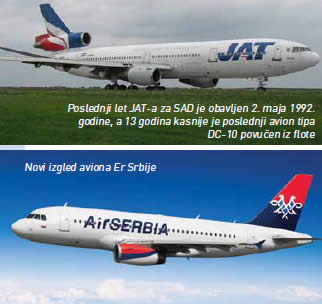 Početkom avgusta ove godine, ime JAT je otišlo u istoriju, stavljena je tačka na priču dugu, sa prekidima, 86 godina ali su ispisana i početna slova novog poglavlja u vazdušnom saobraćaju Srbije. Potpisan je ugovor o strateškom partnerstvu sa jednom od vodećih svetskih kompanija Etihadom iz Ujedinjenih arapskih emirata i osnovana je nova kompanija Air Serbia . Kompanija je uradila promenu brenda, zaštitnog znaka i imena a u početku će koristititi avione JAT -a i leteti na njihovim letovima. Očekuje se da će u oktobru sa novim redom letenja biti otvorene i nove linije sukcesivno sa nabavkom novih aviona i da će Beograd ponovo biti povezan letovima Er Srbije u početku sa još 12 gradova Evrope, Afrike i Bliskog istoka. Preko potrebna modernizacija flote biće izvršena avionima tipa erbas 319 . Etihad će u narednim godinama, zajedno sa Vladom Srbije, uložiti sredstva u novu kompaniju koja će nositi zastavu Srbije širom sveta.