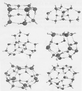 Istraživanje klastera vode metodama kvantne hemije veoma je aktivno područje teorijske hemije, i na tu temu je objavljen veliki broj radova. Najtačniji proračuni su, iz razumljivih razloga, vršeni na malim klasterima. Za klastere sa n=3,4,5 teorijski rezultati se u potpunosti slažu sa eksperimentalnim. U slučaju heksamera, došlo se do otkrića da postoji čak pet različitih geometrijskih rasporeda šest, vodoničnim vezama povezanih, molekula H 2 O , koji imaju istu energiju. Ovi klasteri su prikazani na slici 2; srednji klaster u drugom redu je onaj za koji se, na osnovu eksperimentalnih podataka, tvrdi da je jedini heksamer koji postoji u vodi.