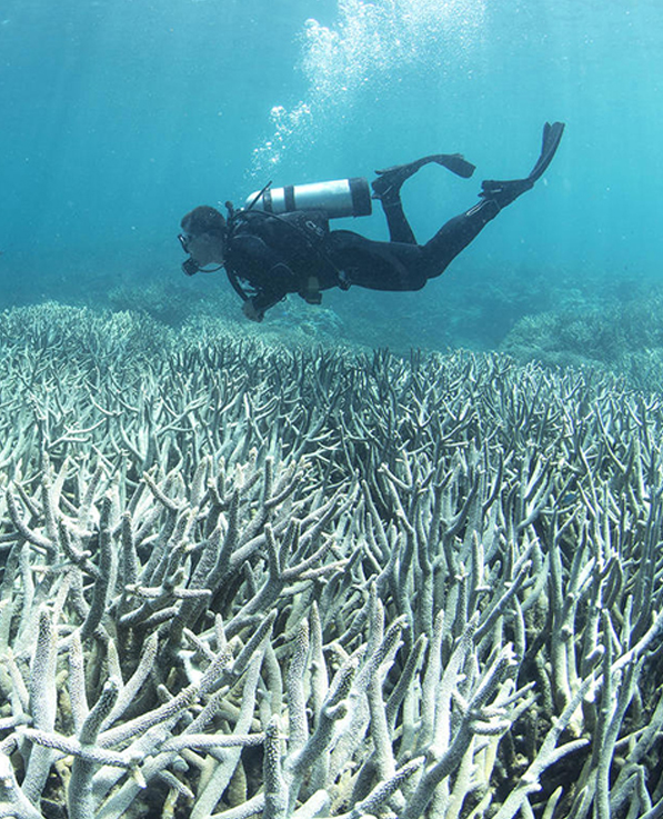 Oko polovine australijskog Velikog koralnog grebena uništeno je 2016. i 2017, nakon što se temperatura okeana povećala do te mere da je uticala na izbeljivanje korala. To je proces koji se dešava kada je temperatura previsoka i uzrokuje nestanak raznobojnih algi koje žive na grebenu. Najnovijim istraživanjem dokazano je da se količina koralne larve na grebenu 2018. smanjila za 89 % u odnosu na pređašnje stanje.